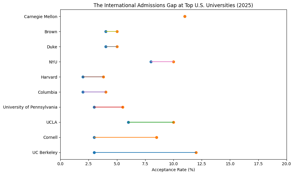 This chart compares overall undergraduate acceptance rates with published international acceptance rates at selected top U.S. universities. The distance between dots reflects how differently international applicants experience admissions selectivity relative to the headline acceptance rate.
