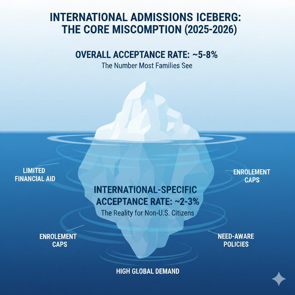 That’s why a school with a “9% acceptance rate” can feel attainable — while the international admit rate sits much closer to 3–4%.